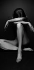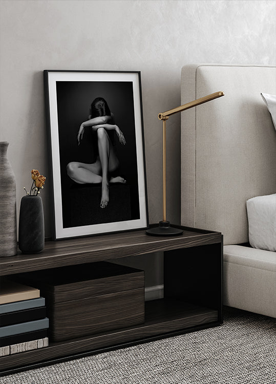 Ein starkes Kunstfoto in Schwarz-Weiß einer sitzenden Frau, das rohe Emotionen, Sinnlichkeit und Verletzlichkeit zum Ausdruck bringt. Mit dramatischer Beleuchtung und monochromem Ausdruck ruft das Werk Themen wie Traurigkeit, Stärke und Melancholie hervor und wird zu einem auffälligen figurativen Wandkunstwerk.