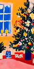Settle into a snug holiday nook where candles flicker beside a vase of winter florals, evergreen sprigs, and playful ornaments. A frosted window hints at nightfall while a tree twinkles nearby. Painterly textures and vibrant hues bring festive warmth to your space. Artwork by Treechild. Perfect for mantels, reading nooks, and joyful gatherings.
