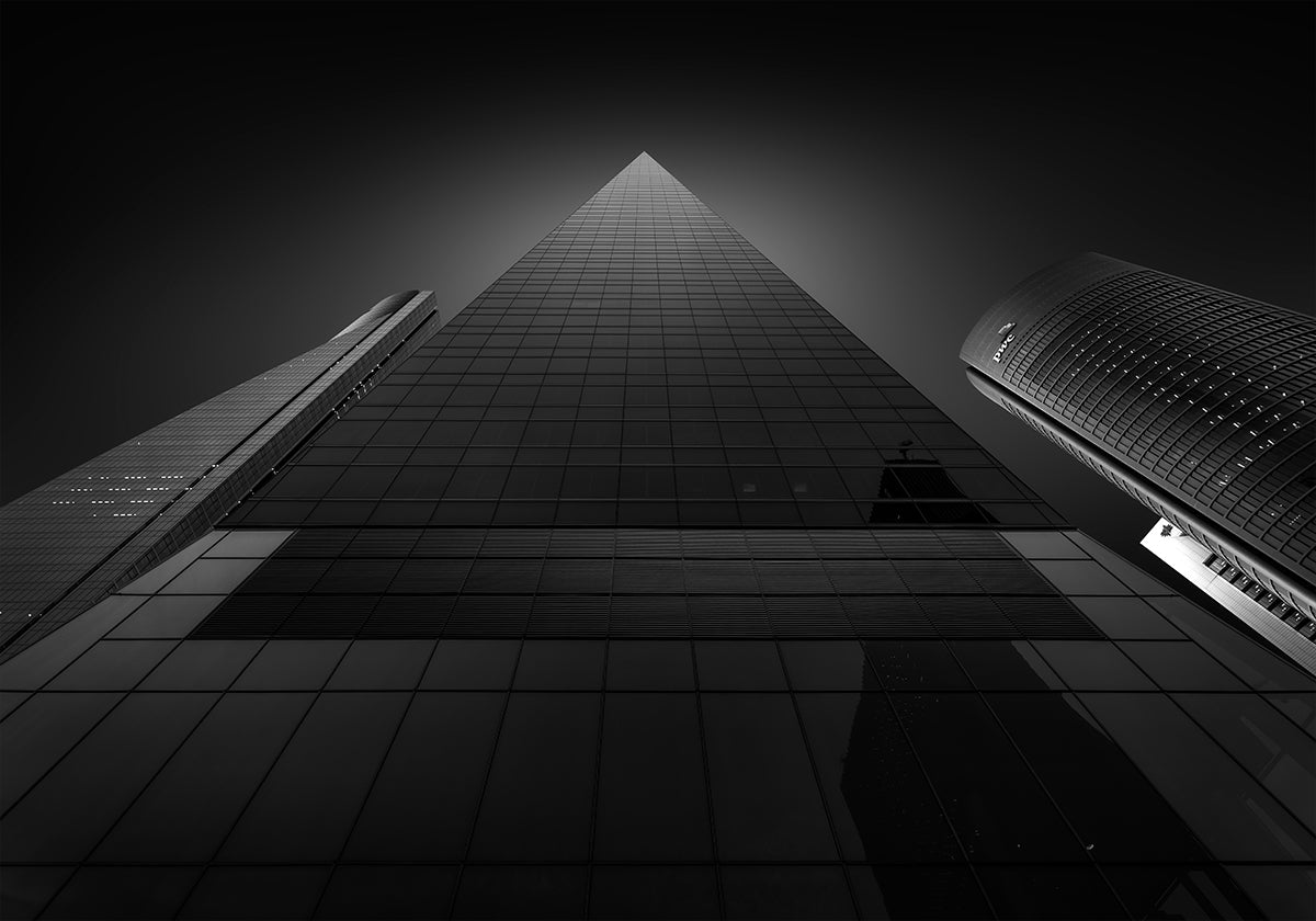 Eine grafische, moderne Hommage an die Skyline von Madrid: Jorge Ruiz Dueso fängt die ikonischen Wolkenkratzer von CTBA in einer scharfen, geometrischen Perspektive ein, in der fünf Türme in den Himmel ragen. Der Kontrast zwischen Glas, Stahl und dem offenen Himmel erzeugt Rhythmus, Tiefe und großstädtische Energie in einem zeitlosen Motiv. Perfekt für Architektur- und Designliebhaber.