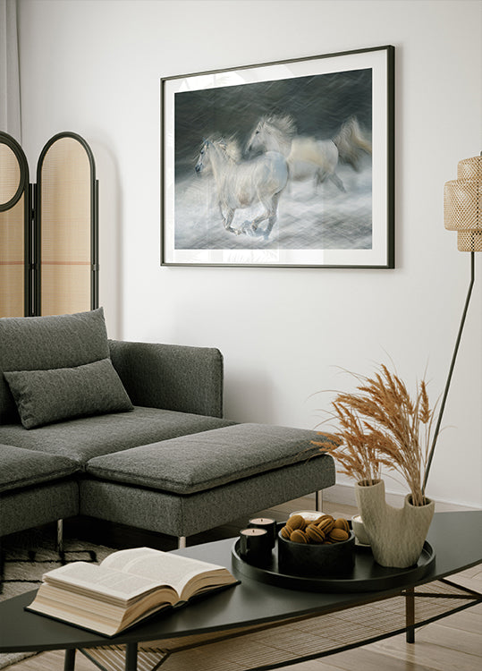 Zwei Pferde durchbrechen im vollen Galopp die verschneite Stille, als wäre es ein Duell. Der Schnee wirbelt wie Rauchsignale um ihre Muskeln und Mähnen, während das grelle Winterlicht einen hellen, fast grafischen Ausdruck erzeugt. Eine dramatische und elegante Pferdevision des Fotografen Milan Malovrh. Kraft und Anmut treffen in einem wirbelnden Wintertanz aufeinander.