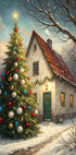 Ein friedliches Wintermotiv mit einem kleinen Haus im Schnee und einem wunderschön geschmückten Weihnachtsbaum, der in warmen Lichtern strahlt. Leichter Schnee fällt über die Bühne, während die beleuchteten Fenster und der goldene Schein für eine ruhige, nostalgische Weihnachtsstimmung sorgen. Ideal für Wohnzimmer, Eingangsbereich oder als ruhiger und festlicher Teil einer winterlichen Galeriewand.