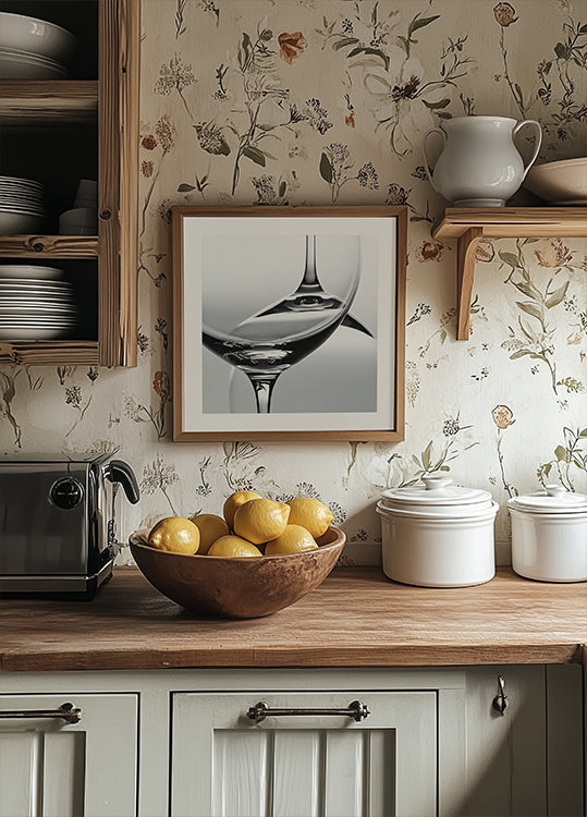 Minimalistisches und monochromes Poster, bei dem zwei Weingläser reine Geometrie bilden: eines stehend, das andere umgedreht. Die geschwungenen Silhouetten spiegeln sich in hellem Licht und sanften Schatten, während der negative Raum Ruhe und Ausgeglichenheit schafft. Ein elegantes Stillleben, perfekt für die Küche, den Barwagen oder das Esszimmer. Subtil und anspruchsvoll, mit einer ruhigen Dramatik.