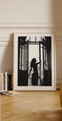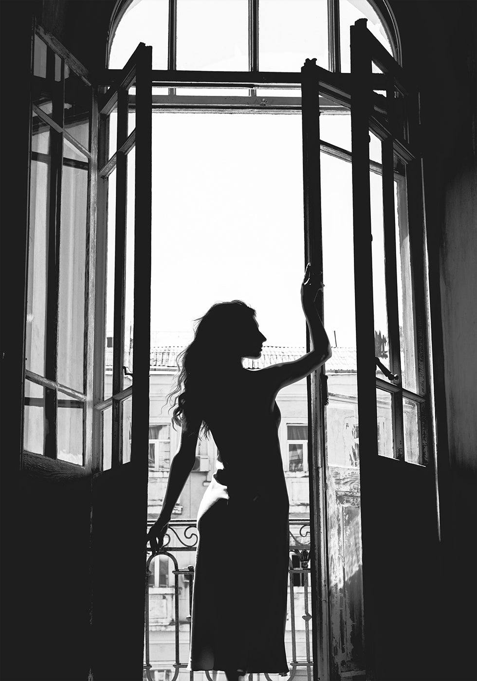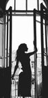 Die auffällige schwarz-weiße Silhouette einer Frau, die an einer Balkontür steht, strahlt Eleganz und Gelassenheit aus. Das Spiel von Licht und Schatten schafft eine zeitlose Atmosphäre und macht dieses Kunstwerk zu einem verführerischen Statement für Innenräume, die von Raffinesse, Weiblichkeit und moderner Romantik inspiriert sind.