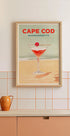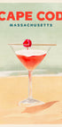 Ein lebhaftes Retro-Poster aus Cape Cod, Massachusetts, mit einem klassischen Cocktail in einem Martini-Glas und einer Kirsche. Mit einer Strandkulisse und warmen Tönen fängt dieses Kunstwerk den Küstencharme, die Entspannung und die zeitlose Sommeratmosphäre ein, für die Cape Cod bekannt ist.