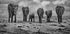 Ein starkes Schwarz-Weiß-Wildtierfoto einer Elefantenherde, die durch die afrikanische Savanne streift. Das Bild fängt sowohl Stärke als auch Zärtlichkeit ein und symbolisiert Familie, Schutz und Einheit in der Natur.
