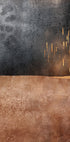 Ein modernes abstraktes Kunstwerk mit erdigen Tönen in Braun, Orange und Grau, kombiniert mit einer rustikalen strukturierten Oberfläche. Goldene vertikale Striche sorgen für Tiefe und Kontrast und sorgen für einen zeitlosen Ausdruck. Perfekt für minimalistische, rustikale oder moderne Innenräume, die Wärme und Eleganz wünschen.