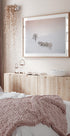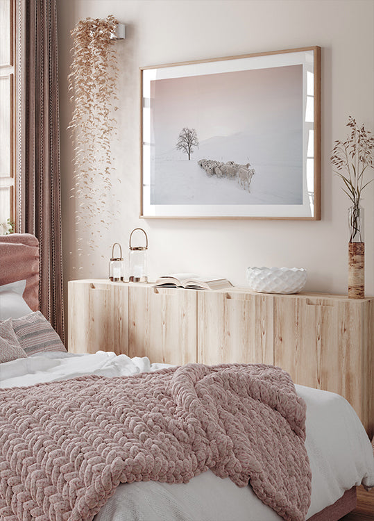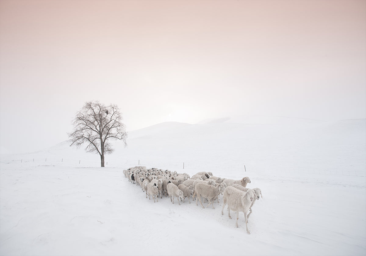 Ein ruhiger Wintermorgen entfaltet sich in sanften Pastelltönen: Eine Schafherde zieht auf der Suche nach Futter durch die schneebedeckte Landschaft, während eine einsame Baumsilhouette als stilles Leuchtfeuer in der Kälte steht. Die poetische Komposition von Bingo Z fängt ländliche Ruhe, frostige Luft und den zartrosa Himmel ein.