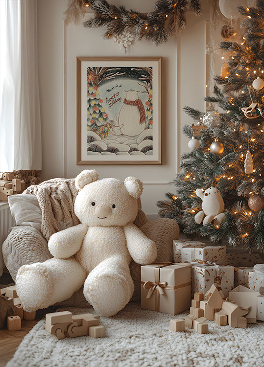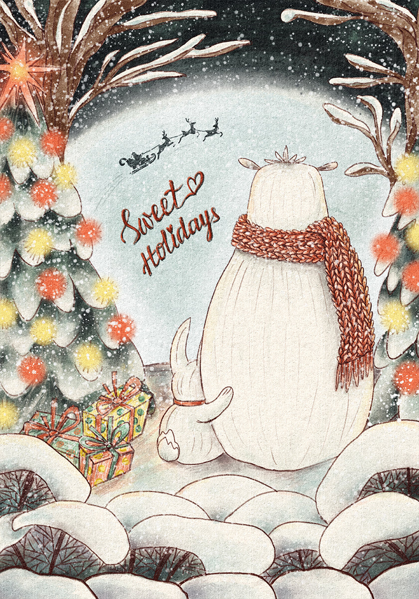 Mit Heart of the Forest lässt uns Olena Kovalova eine stille Waldlichtung betreten, wo sich ein Bär und ein Kaninchen zwischen Schneeflocken und Fichten treffen. Vintage-inspirierte Weihnachtstöne in Rot, Grün und Blaugrün verleihen der frostigen Szene Wärme und erwecken Kindheitsabenteuer und Winterspaß zum Leben. Eine süße Hommage an die Ruhe von Weihnachten im Herzen der Natur.