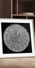 Hypnose von Giorgio Toniolo entführt den Blick in einen monochromen Wirbel aus konzentrischen Ringen, die im Fibonacci-Rhythmus pulsieren und eine hypnotische, sphärische Illusion bilden. Strenge Symmetrie und scharfer Kontrast vereinen Ruhe und Spannung – ein minimalistisches Statement-Poster, das die Wand in einen meditativen Mittelpunkt verwandelt.