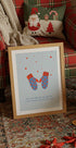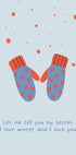 Ein winterliebendes Poster von Ohkimiko: zwei weiche Strickfäustlinge, die sich in einem Herzen treffen, umgeben von fallenden Schneeflocken und kühlen Blaugrautönen. Eine poetische Hommage an Kälte und Liebe – schafft Gemütlichkeit im Wohnzimmer, im Eingangsbereich oder im Kinderzimmer, mit schlichter, nordischer Ruhe und grafischer Magie. Ideal als liebevolles Geschenk zur Advents- und Weihnachtszeit.