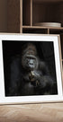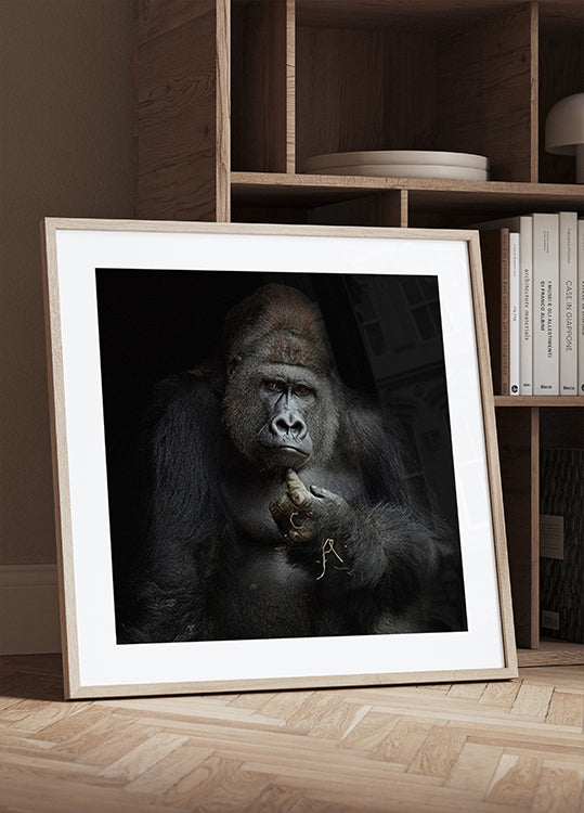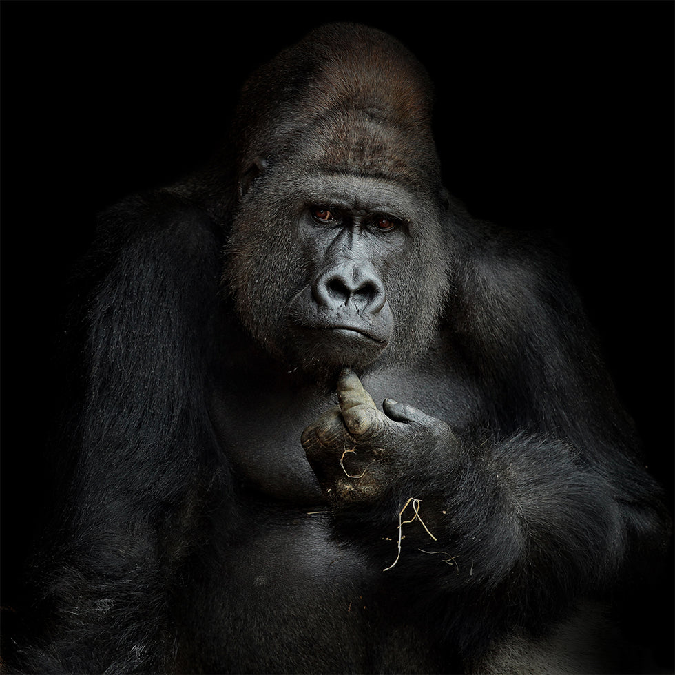 Ein dramatisches, zurückhaltendes Porträt eines Silberrückens, eingehüllt in tiefe Schatten vor einem schwarzen Hintergrund. Der Blick ist intensiv und nachdenklich, wie ein stilles Gespräch über Stärke, Verletzlichkeit und Weisheit. Antje Wenner-Braun fängt den magischen Moment ein, wenn sich das Gesicht des Primaten in reine, moderne Poesie verwandelt. Eine Hommage an die Würde und stille Kraft des Gorillas.