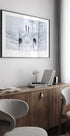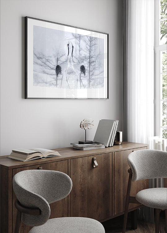 In love af Larry Deng APA viser et par traner i en frostklar, snedækket stilhed. Deres yndefulde dans og buede halse tegner et diskret hjerte, mens dæmpede vintertoner og let tågedis skaber ro, poesi og romantik – et nordisk blikfang til stue eller soveværelse. En smuk gave til bryllup, årsdage og Valentinsdag.