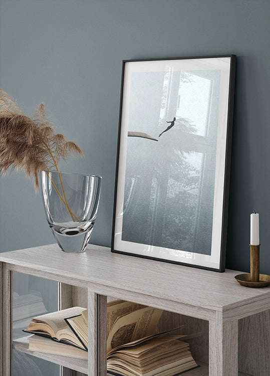 Ein klares und symbolisches Kunstwerk, das eine Figur zeigt, die von einer Kante ins Ungewisse springt. Das Poster fängt einen Moment des Vertrauens, des Mutes und der Hingabe ein – ideal für kontemplative Räume und zum Nachdenken.
