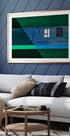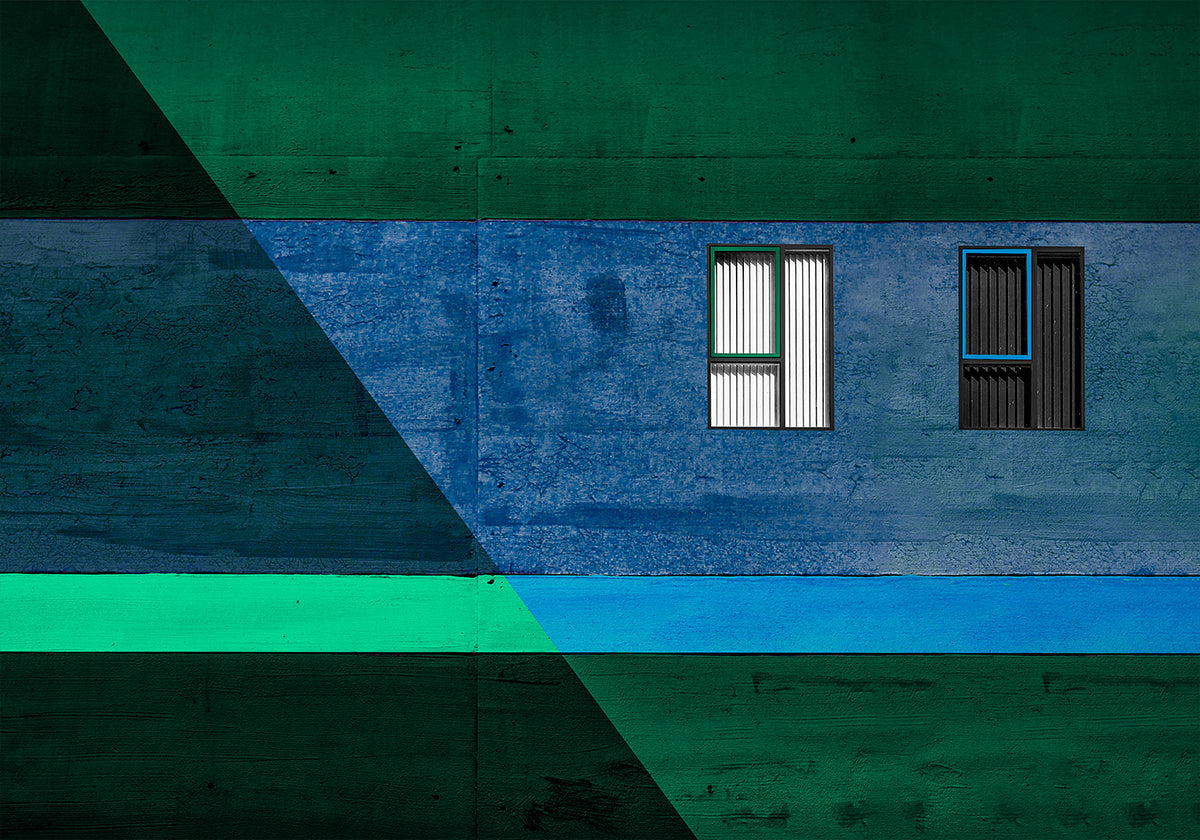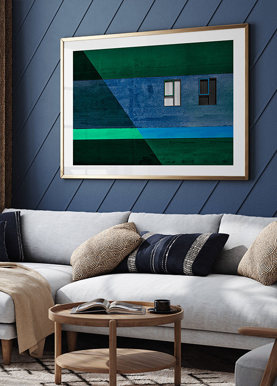 Ein kühnes architektonisches Kunstwerk mit zwei Fenstern mit auffälligen schwarzen und weißen Jalousien, die vor einer strukturierten Wand in tiefen Blau- und Grüntönen stehen. Die scharfen Linien und die geometrische Komposition schaffen ein modernes abstraktes Werk voller Ausgewogenheit, Kontrast und visueller Spannung.