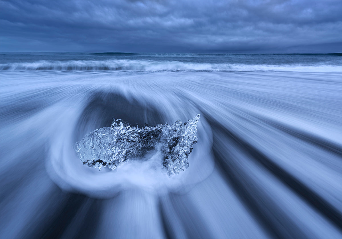 Oplev Jökulsárlóns magi i et drømmende øjeblik: blåis driver mod den sorte sandstrand, mens bølgerne stryger silkeblødt hen over kysten i det første, rosa morgengry. Tågede vandspor og krystalklare isstykker skaber ro og drama på én gang. Fotografi af Jingshu Zhu. En hyldest til Islands rå skønhed ved kanten af islagunen.
