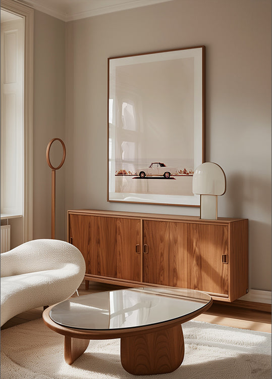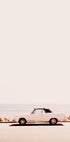 Ein minimalistisches und nostalgisches Foto eines am Meer geparkten Oldtimer-Cabriolets. Dieses Kunstwerk fängt die Essenz der kalifornischen Küste ein und weckt Erinnerungen an Roadtrips, Sommertage und zeitlosen Retro-Charme.