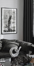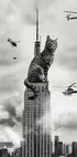 Ein surreales und humorvolles Kunstwerk, das eine riesige Katze auf dem Empire State Building zeigt, umgeben von Hubschraubern in einer von King Kong inspirierten Parodie. Dieses schwarz-weiße Stadtbild ist perfekt für Katzenliebhaber und Fans lustiger Stadtdekoration.