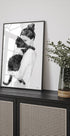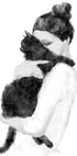 Eine zarte schwarz-weiße Aquarellillustration einer Frau, die ihre Katze umarmt. Dieses sensible Kunstwerk drückt Liebe, Intimität und die zeitlose Bindung zwischen Mensch und Haustier aus und eignet sich perfekt für minimalistische und von Tieren inspirierte Innenräume.