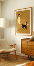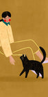 Eine moderne Illustration einer Frau und ihrer schwarzen Katze, gestaltet in warmen neutralen Tönen mit einer minimalistischen und dennoch stilisierten Ästhetik. Dieses Kunstwerk strahlt Gemütlichkeit, Gemeinschaft und Liebe aus – perfekt für Häuser mit Katzenliebhabern.