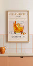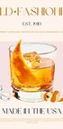 Ein Retro-inspiriertes Poster eines altmodischen Cocktails mit einem Whiskeyglas, Orangenschale und Eiswürfeln. Mit ausgeprägter Typografie und Vintage-Design zelebriert dieses Kunstwerk den zeitlosen amerikanischen Cocktail. Perfekt als Küchendekoration, Barposter oder für die Hausbar.