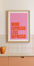Hell, mutig und humorvoll – dieses moderne Typografie-Poster zeigt den verspielten Satz „More Espresso Less Depresso“ in kräftigem orangefarbenem Text auf einem rosa Hintergrund. Eine perfekte Kombination aus Motivation und Spaß, ideal für Küchen, Büros oder Kaffeeecken. Perfekt für Kaffeeliebhaber mit Sinn für Humor.