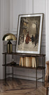 Ein stimmungsvolles Vintage-Poster zu Giacomo Puccinis La Bohème: ein Winterabend im Schnee und Mondlicht, an dem sich eine kleine Gruppe vor der Theaterfassade versammelt. Rote Akzente brechen die Kälte, die Silhouetten der Bäume rahmen das Bild ein und Gesang, Freundschaft und die Poesie der Großstadt sind in der historischen Illustration spürbar. Eine Hommage an Romantik, den Zauber der Oper und Winterpoesie.