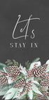 Et frostkysset blomsterstilleben med fyrrekogler, vinterbær og grønt, let pudret af sne, indrammet af kølige hvide og blå nuancer. Den varme opfordring “Let’s stay in” giver en rolig, hyggelig stemning – perfekt til vinterens stille øjeblikke. Af kunstneren Rosana Laiz Blursbyai. Et elegant, roligt fokuspunkt til entré, stue eller soveværelse.