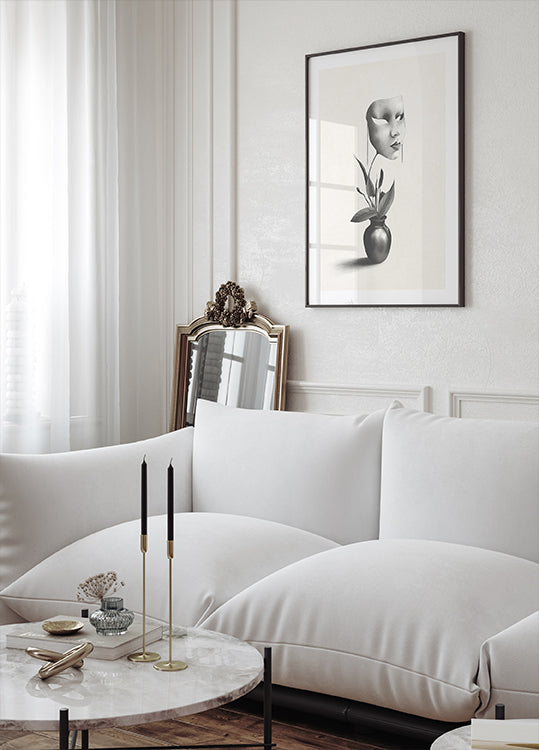 Eine surreale Schwarz-Weiß-Illustration einer geheimnisvollen schwebenden Maske, die aus dem Stängel einer Topfpflanze wächst. Die Kombination aus organischen und künstlichen Elementen schafft einen markanten Kontrast und ruft Themen wie Identität, Transformation und verborgene Emotionen hervor. Eine perfekte Ergänzung für Konzeptkunst und moderne Innenräume.
