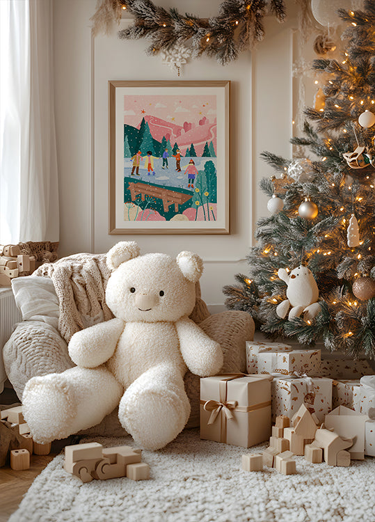 Ein verspieltes Wintermotiv von Bea Müller: Auf einem zugefrorenen See laufen Kinder und Erwachsene um einen geschmückten Weihnachtsbaum herum, während Schneeflocken in der Luft tanzen. Der Hintergrund offenbart sanfte Berge und dunkles Fichtenholz, die die festliche Atmosphäre umrahmen. Die Farben sind warm und lebendig, voller Winterzauber. Eine Hommage an die Familie, die Gemeinschaft und die Freude an der Jahreszeit.