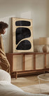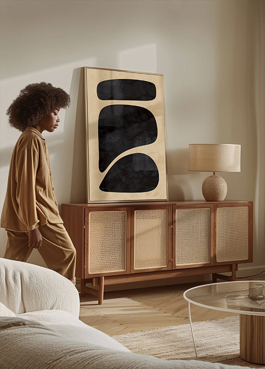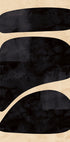Ein elegantes abstraktes Kunstwerk mit drei markanten schwarzen Formen, die vor einem warmen beigen Hintergrund gestapelt sind. Die minimalistische Komposition und die strukturierte Oberfläche sorgen für einen modernen und raffinierten Touch – perfekt für Galeriewände, Wohnzimmer oder skandinavisch inspirierte Innenräume.