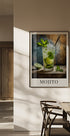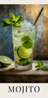 Lebendiges Kunstwerk, das einen klassischen Mojito-Cocktail mit Minzblättern, Limettenspalten und Strohhalmen in einem mit Eis gefüllten Glas darstellt. Der strukturierte Hintergrund betont die frische und erfrischende Atmosphäre, perfekt für Fans von Trink- und Cocktailkunst.