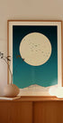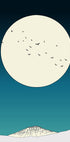 „Moonlit Ascent“ von Nicholas zeigt eine ruhige Nacht, in der ein Vollmond über schneebedeckten Bergsilhouetten aufgeht. Tiefblaue Farbtöne bilden einen sanften Farbverlauf zum Horizont, während Vögel lautlos vorbeigleiten. Der schlichte, grafische Ausdruck und die klaren Linien erzeugen eine verträumte, meditative Atmosphäre. Eine minimalistische Nachtlandschaft mit Schneemond und Berggipfeln im Kontrast.