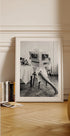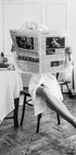 Ein stilvolles Schwarz-Weiß-Foto einer Frau im Bademantel mit einem Handtuch um den Kopf, die beim Frühstück elegant eine Zeitung liest. Mit seiner raffinierten Schlichtheit und zeitlosen Ästhetik fängt das Kunstwerk die Essenz von mühelosem Chic ein und eignet sich perfekt für modeinspirierte Innenräume.