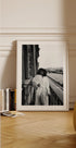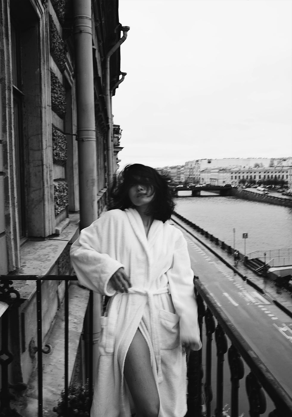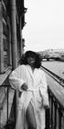 Ein stilvolles Schwarz-Weiß-Foto, das die Eleganz eines Morgenmoments auf einem Balkon im Pariser Stil einfängt. Die Figur im Bademantel strahlt mühelosen Stil und Intimität aus, mit der Stadt und dem Fluss als ruhigem Hintergrund. Perfekte Wandkunst für alle, die Mode, Fotografie und zeitlose urbane Ästhetik lieben.