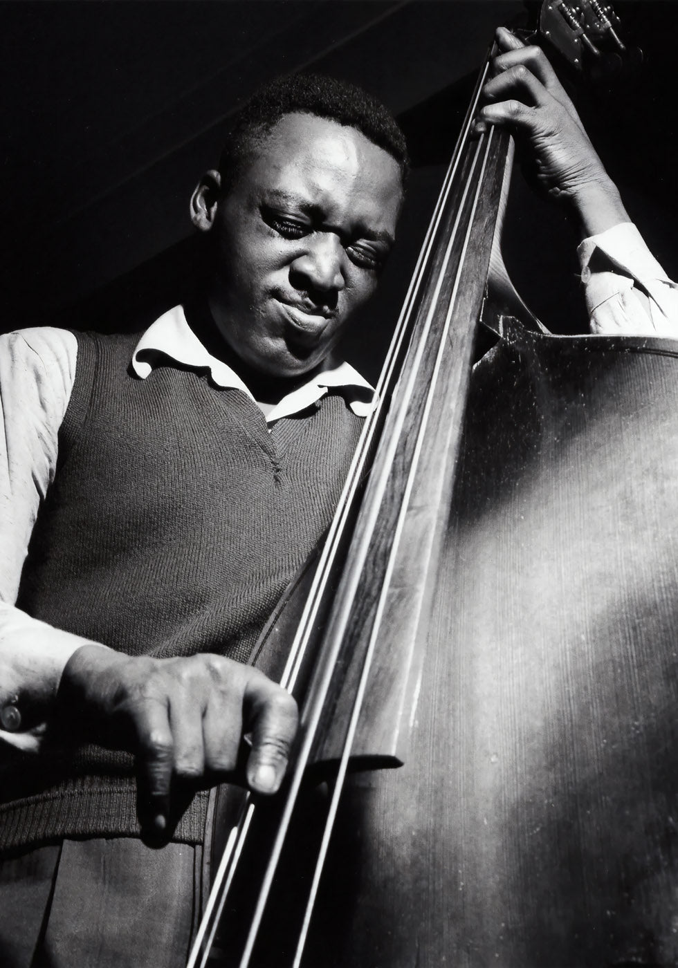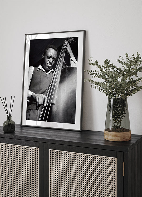 Ein kraftvolles Schwarz-Weiß-Foto, das die Leidenschaft und Intensität eines Jazzmusikers einfängt, der Kontrabass spielt. Die dramatische Beleuchtung und die ausdrucksstarke Komposition unterstreichen die tiefe Verbundenheit des Künstlers mit seinem Instrument. Eine zeitlose Hommage an Jazz, Musik und künstlerischen Ausdruck – perfekt für Musikliebhaber und Liebhaber der Vintage-Fotografie.