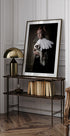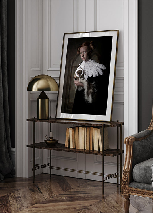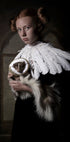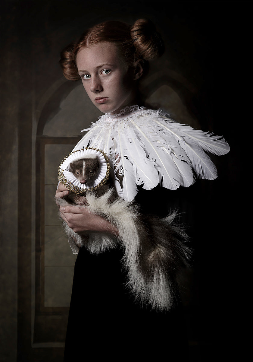 Ein poetisches, figuratives Porträt einer jungen Frau im retro-mittelalterlichen Stil, geschmückt mit Federn und dramatischem Kragen, in Begleitung eines neugierigen Stinktierfreundes. Die gedeckten, nostalgischen Töne und feinen Details sorgen für einen verträumten Blickfang. Erstellt von der Künstlerin Carola Kayen-Mouthaan. Ein Werk mit europäischer Vintage-Atmosphäre, ideal als elegantes Statement im Zuhause.