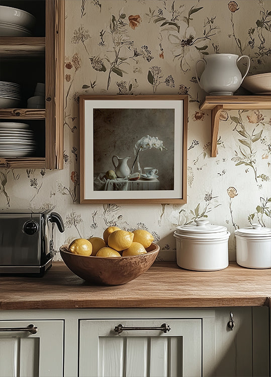 „Old Wall“ von Margareth Perfoncio fängt ein Stillleben vor einer abgenutzten, weiß getünchten Wand ein: ein Tisch, der mit einer weichen Tischdecke, zarten Tassen, Gläsern und einer hellen Vase mit Orchidee und Birne gedeckt ist. Gedeckte, natürliche Farbtöne und ein sanftes, schräges Licht schaffen Ruhe, Poesie und zeitlose Eleganz für Küche, Wohn- und Essbereich. Perfekt für eine ruhige, nordische Atmosphäre.