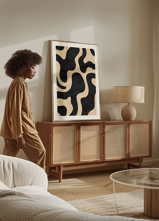 Ein modernes abstraktes Poster, inspiriert von Picasso, mit wirbelnden schwarzen Linien, die ein kompliziertes Rosenmuster bilden. Die kontrastreiche Schwarz-Beige-Palette unterstreicht den künstlerischen und raffinierten Ausdruck. Eine Hommage an zeitgenössische und abstrakte Kunst, perfekt für moderne Interieurs und Kunstliebhaber.