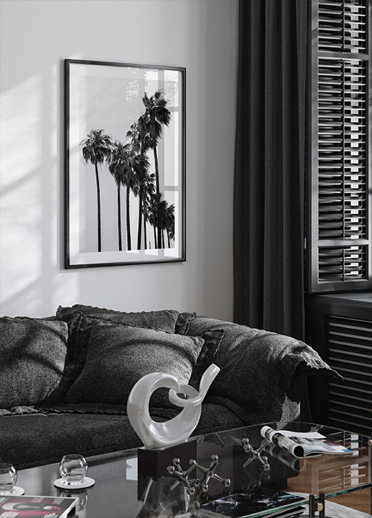 Eine stilvolle Schwarz-Weiß-Fotografie von hohen Palmen, die sich im Wind wiegen. Das minimalistische und zeitlose Design macht es ideal für moderne und küstennahe Innenräume.
