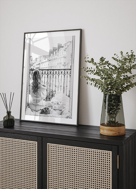 Ein zeitloses Schwarzweißfoto, das die Essenz eines Morgens in Paris einfängt. Eine Frau im weichen Bademantel und mit welligem Haar genießt ein luxuriöses Frühstück auf einem bezaubernden Balkon mit schmiedeeisernem Geländer und blickt auf die elegante Haussmann-Architektur von Paris. Die Szene strahlt Kultiviertheit, Ruhe und klassische Romantik aus. Perfekt für alle, die Paris, Reisefotografie und europäische Ästhetik lieben.
