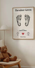 Ein zeitloses und elegantes personalisiertes Poster mit Baby-Fußabdrücken und individuellen Geburtsdaten wie Name, Datum, Uhrzeit, Gewicht, Größe und Geburtsort. Das klare, minimalistische Design mit einem weichen, neutralen Hintergrund macht es zu einem perfekten Andenken für frischgebackene Eltern und zu einer schönen Ergänzung für jedes Kinderzimmer oder jede Familienwand.