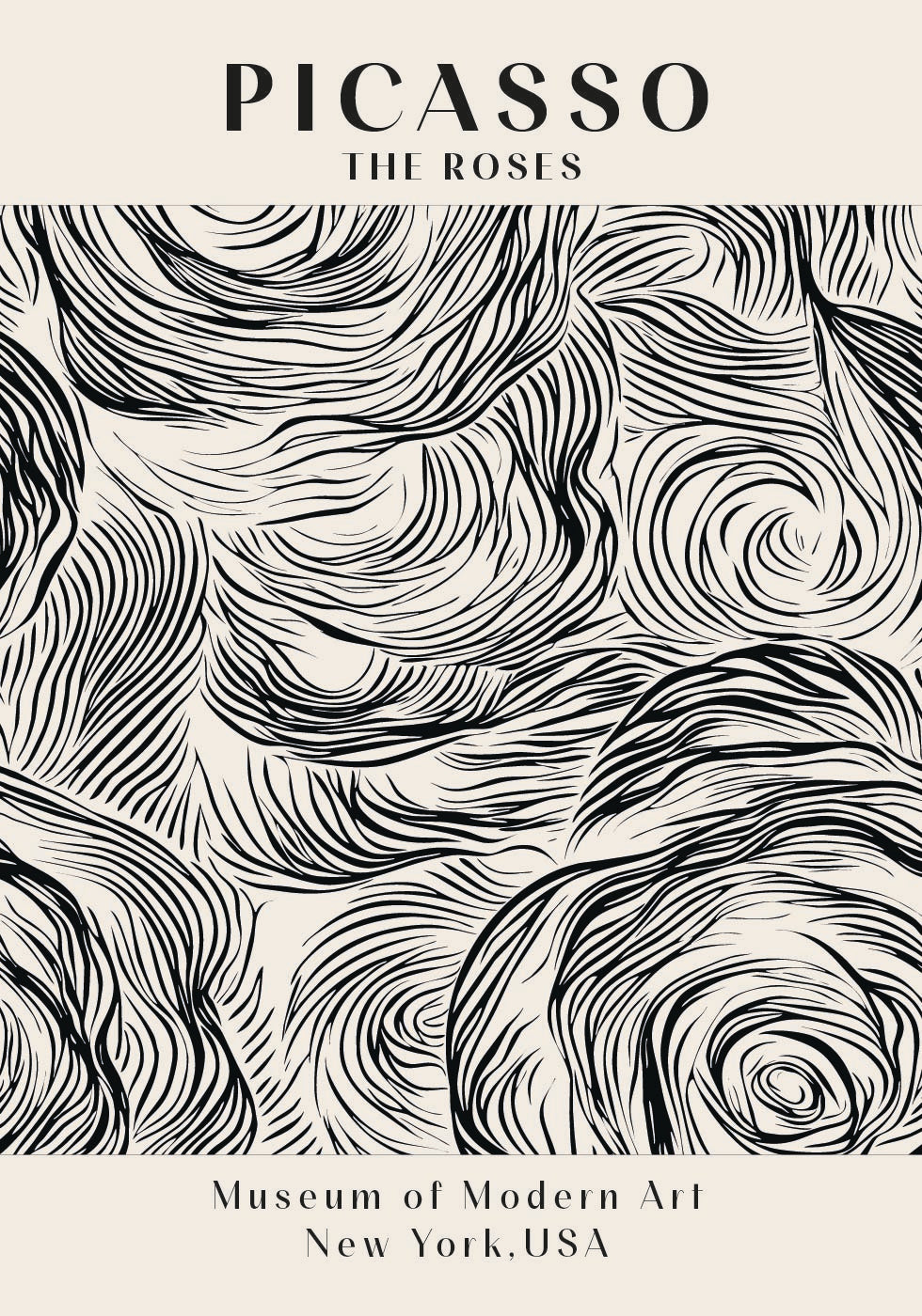 Ein modernes abstraktes Poster, inspiriert von Picasso, mit wirbelnden schwarzen Linien, die ein kompliziertes Rosenmuster bilden. Die kontrastreiche Schwarz-Beige-Palette unterstreicht den künstlerischen und raffinierten Ausdruck. Eine Hommage an zeitgenössische und abstrakte Kunst, perfekt für moderne Interieurs und Kunstliebhaber.