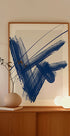 Ein modernes abstraktes Kunstposter mit kräftigen blauen Pinselstrichen auf hellem Hintergrund. Die dynamischen Striche erzeugen Bewegung und Textur und machen es zu einem auffallend minimalistischen Werk, perfekt für moderne Innenräume.