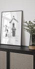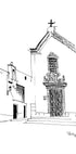 En stemningsfuld, monokrom illustration af et charmerende portugisisk bytorv: hvide facader, ornamenterede døre og vinduer, en rolig kirkeplads og smalle gyder, der mødes i skarpe linjer og bløde skygger. Minimalistisk linjetegning af Awol Art Alex, der indfanger rejselyst og tidløs arkitektur i solen.