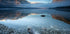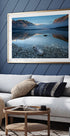 Ein ruhiges Landschaftsposter des Bohinjer Sees in Slowenien, wo stilles Wasser die Berge und den Nebel widerspiegelt. Die klare Küstenlinie mit Steinen und einem Baumstamm verstärkt die ruhige und harmonische Atmosphäre und ist ideal, um in jedem Raum Frieden und Ruhe zu schaffen.