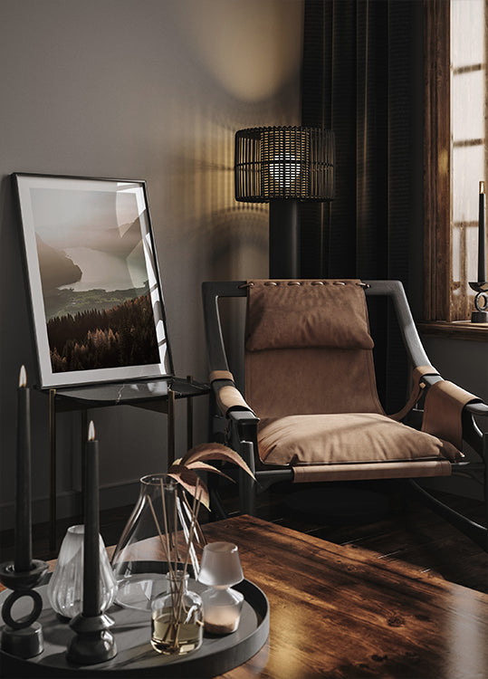 Poster Nebeliger See und Bergblick