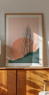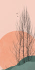 Eine beruhigende minimalistische Landschaft, Gelassenheit bei Sonnenuntergang fängt die stille Schönheit der Natur mit auffallender Einfachheit ein. Schlanke, zarte Baumsilhouetten erheben sich vor einer großen, warmen orangefarbenen Sonne, umrahmt von sanften, sanften grünen Hügeln und einem blassen pfirsichfarbenen Himmel. Darüber schweben zwei kleine Vögel, die ein Gefühl von Frieden und Offenheit vermitteln. Die ausgewogene Komposition und die gedämpfte Farbpalette machen dieses Stück perfekt für moderne, skandinavische oder japanisch inspirierte Innenräume und schaffen einen ruhigen Mittelpunkt in jedem Raum.