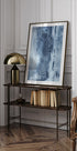 Ein ruhiges, abstraktes Motiv in tiefen Blautönen, bei dem vertikale, fließende Linien einen frostigen Fluss über das Bild bilden. Die monochrome Palette sorgt für eine kühle, moderne Atmosphäre, während die sanften Bewegungen für Ausgewogenheit und Tiefe sorgen. Perfekt für minimalistische Räume, die stilvolle Ruhe suchen, oder als Kontrast in warmen Innenräumen.