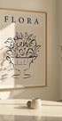 Eine raffinierte, minimalistische Strichzeichnung einer mit Blumen gefüllten Vase, präsentiert in einem eleganten Schwarz-Weiß-Stil. Das Kunstwerk kombiniert Schlichtheit mit Raffinesse und eignet sich als zeitloser Blumendruck für moderne und zeitgemäße Innenräume.