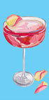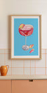 Dieses lebendige Kunstwerk zeigt einen stilisierten Cocktail in einem Glas, dekoriert mit rosa und gelben Blütenblättern, vor einem leuchtend blauen Hintergrund. Die fließenden Pinselstriche des Gemäldes erzeugen einen modernen und energiegeladenen Ausdruck, perfekt für Themen im Zusammenhang mit Getränken oder zeitgenössischer Kunst.